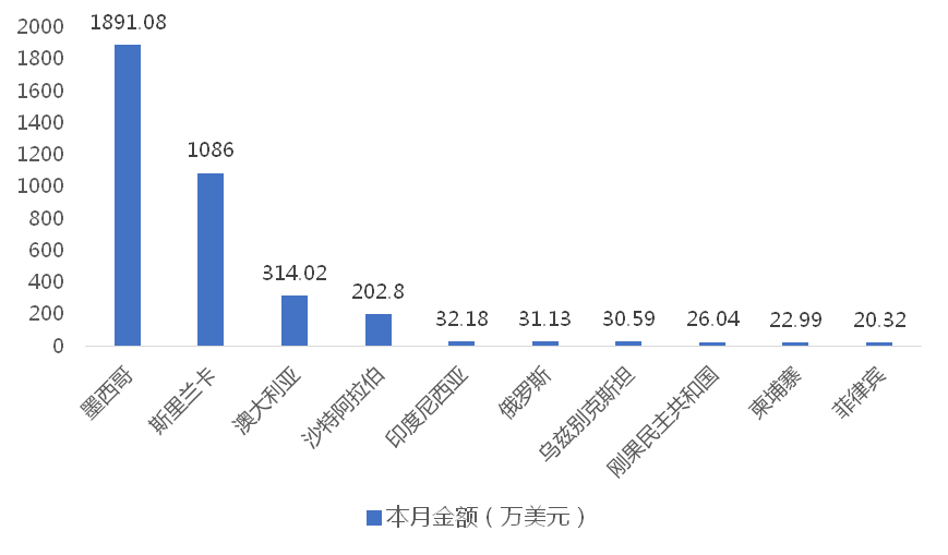 2025年4月,我國龍門式起重機出口金額排名前十位的國家/地區分別為墨西哥、斯里蘭卡、澳大利亞、沙特阿拉伯、印度尼西亞、俄羅斯、烏茲別克斯坦、剛果民主共和國、柬埔寨、菲律賓,合計占我國該產品出口總額的94.64%。其中,向墨西哥出口最多,金額為1891.08萬美元,占出口總額的48.94%。